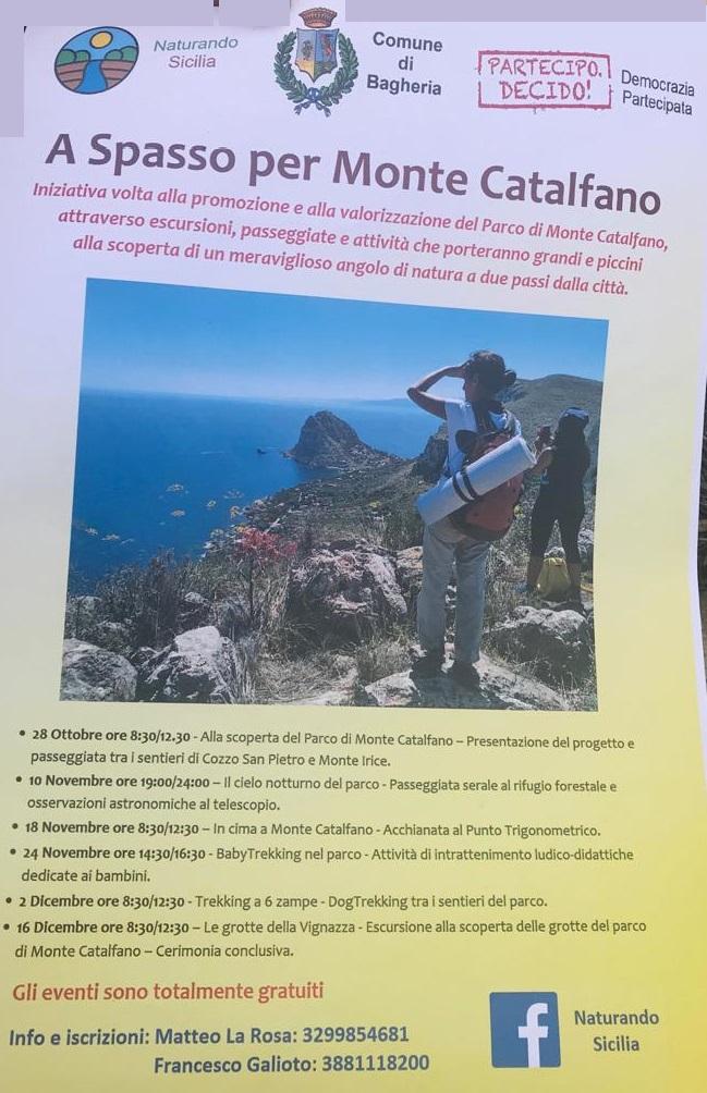 Il prossimo appuntamento, del calendario di iniziative “A spasso per Monte Catalfano” patrocinate dal Comune di Bagheria,  è per 24 novembre “Baby Trekking nel parco”  - attività di intrattenimento ludico-didattiche dedicate ai bambini, a partire dalle ore 14,30 alle 16,30.
