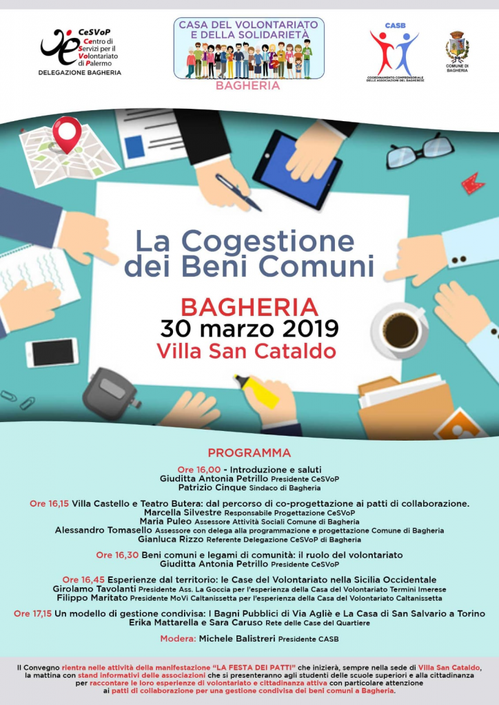 Interverranno: il sindaco di Bagheria Patrizio Cinque, l’assessore alle Politiche Sociali Maria Puleo, l’assessore alla Programmazione Alessandro Tomasello, la presidente CeS.Vo.P. Giuditta Antonia Petrillo, Marcella Silvestre responsabile progettazione CeSVoP, Gianluca Rizzo, referente della delegazione CesVoP Bagheria, Girolamo Tavolanti presidente dell’associazione La Goccia, Filippo Maritato presidente MoVi Caltanissetta che presenteranno rispettivamente le esperienze della case del volontariato di Termini Imerese e Caltanissetta, EriKa Mattarella e Sara Caruso della Rete delle Case di quartiere che illustreranno il caso di successo di gestione condivisa dei bagno pubblici di via Aglié e la casa di San Salvario a Torino. Modera l’incontro Michele Balistreri presidente del Casb.