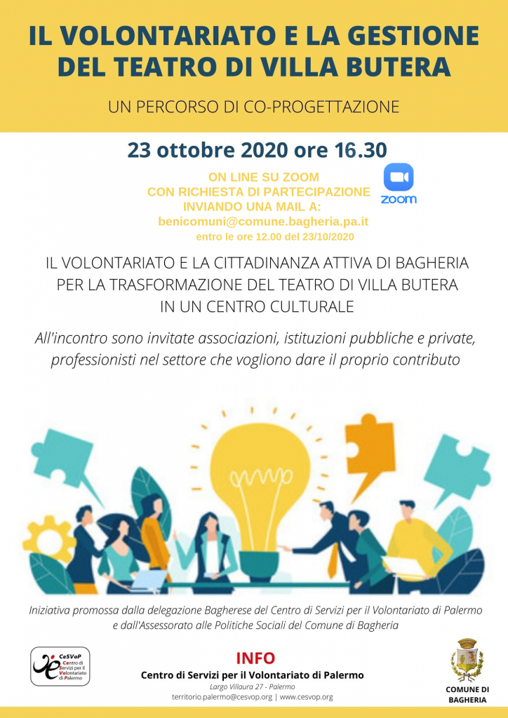 Si terrà venerdì 23 ottobre, alle ore 16,30 un incontro da remoto, mediante piattaforma zoom, sulla co-progettazione da parte di un tavolo di volontariato per la trasformazione del teatro di Villa Butera in centro culturale.