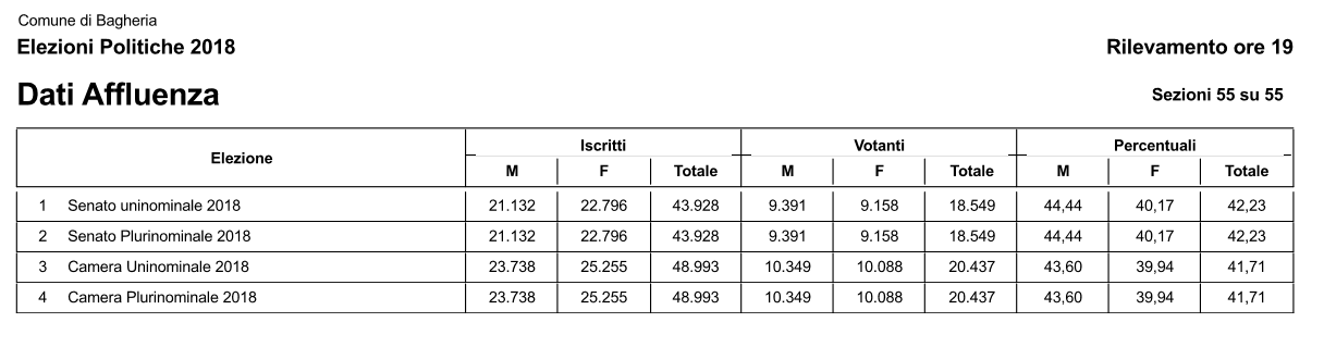 alla Camera su un totale di 48.993 elettori hanno votato 20.437 votanti per una percentuale pari a 41.71%. nello specifico 10.088 donne (39.94%) e 10.349 uomini (43.60%).