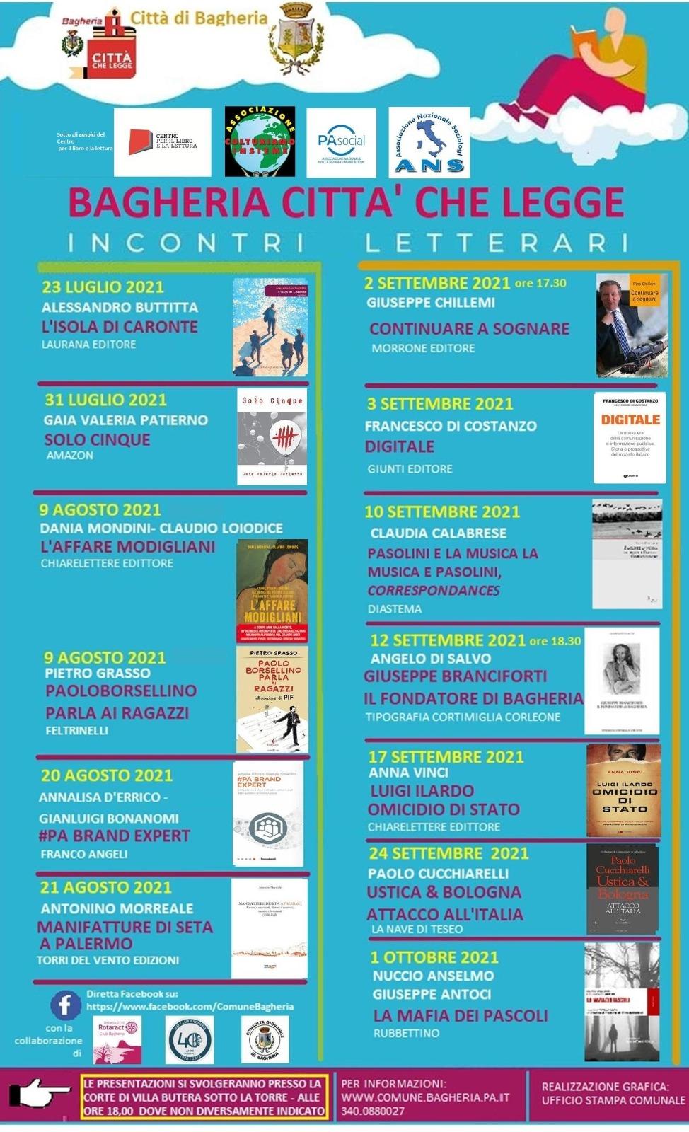 13 incontri letterari per "Bagheria Città che legge", l'iniziativa del Comune di Bagheria per promuovere la lettura. Tra gli autori l'ex presidente del Senato, il senatore Pietro Grasso