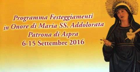 La domenica di festa inizia con la consueta alborata il suono delle campane a festa, i tamburinai e il giro della banda musicale di Aspra “P. Mascagni” per le vie del paese. Seguono le attività veliche in spiaggia per i ragazzi, sempre a cura della Lega Navale di Aspra, e nel pomeriggio, a partire dalle ore 15.30 si svolgerà la tradizionale processione a mare del simulacro di Maria SS. Addolorata.
