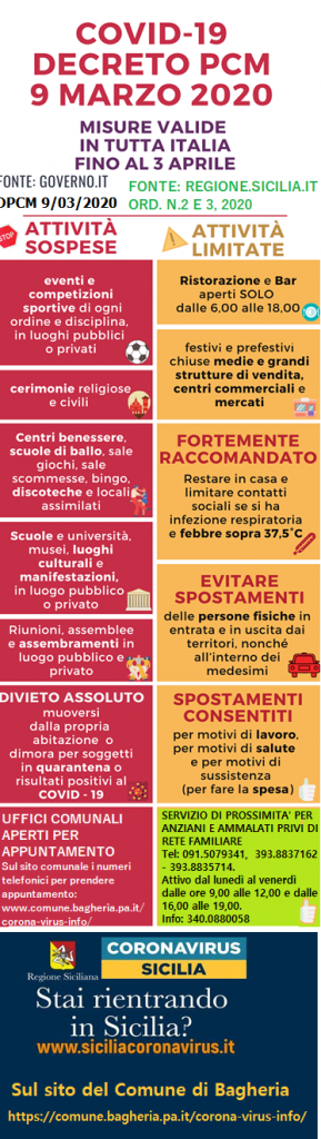 Tali disposizioni producono effetto da oggi 10 marzo 2020 e sono efficaci fino al 3 aprile 2020. Il sindaco del Comune di Bagheria, Filippo Maria Tripoli, ricorda che bar e ristoranti possono essere aperti dalla ore 6,00 alle 18,oo. Tali esercizi possono restare funzionanti, dopo l'orario, ma chiusi al pubblico, solo hanno attivo il servizio di consegna a domicilio.