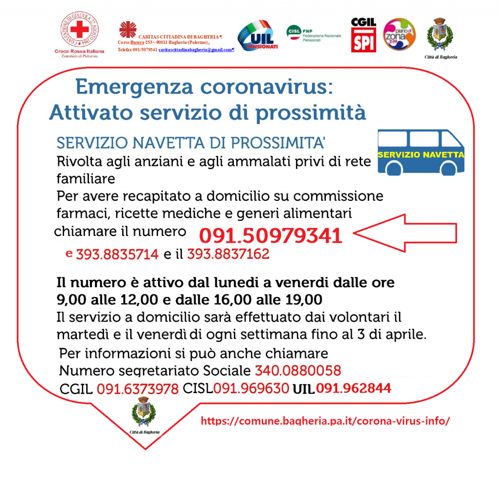 Inoltre sarà attivo dalle prossime ore il servizio di prossimità, organizzato dal Comune in sinergia con CGIL Spi, FNP CISL e UILP, la Croce a Rossa Italiana, la Caritas Cittadina rivolto agli anziani e agli ammalati privi di rete familiare. Per ricevere a domicilio su commissione farmaci, ricette mediche e generi alimentari (su commissione) si potrà chiamare i seguenti numeri telefonici: 091.5079341, 393.8837162 - 393.8835714.
