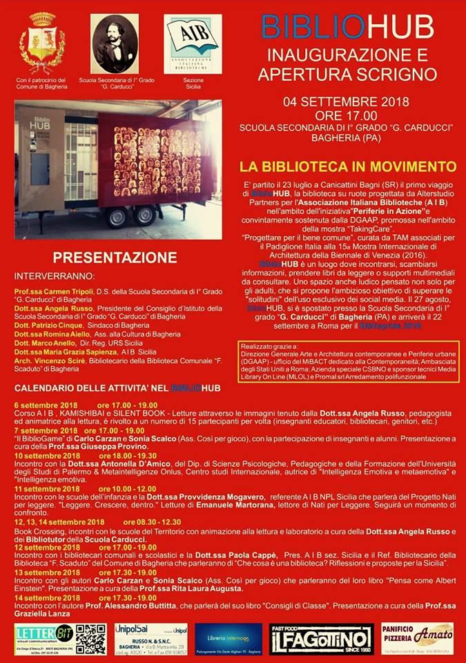 E’ stato inaugurato ieri, 4 settembre e sarà a Bagheria sino al 14 settembre, “BiblioHub” il progetto della biblioteca in movimento presso la scuola media Carducci.