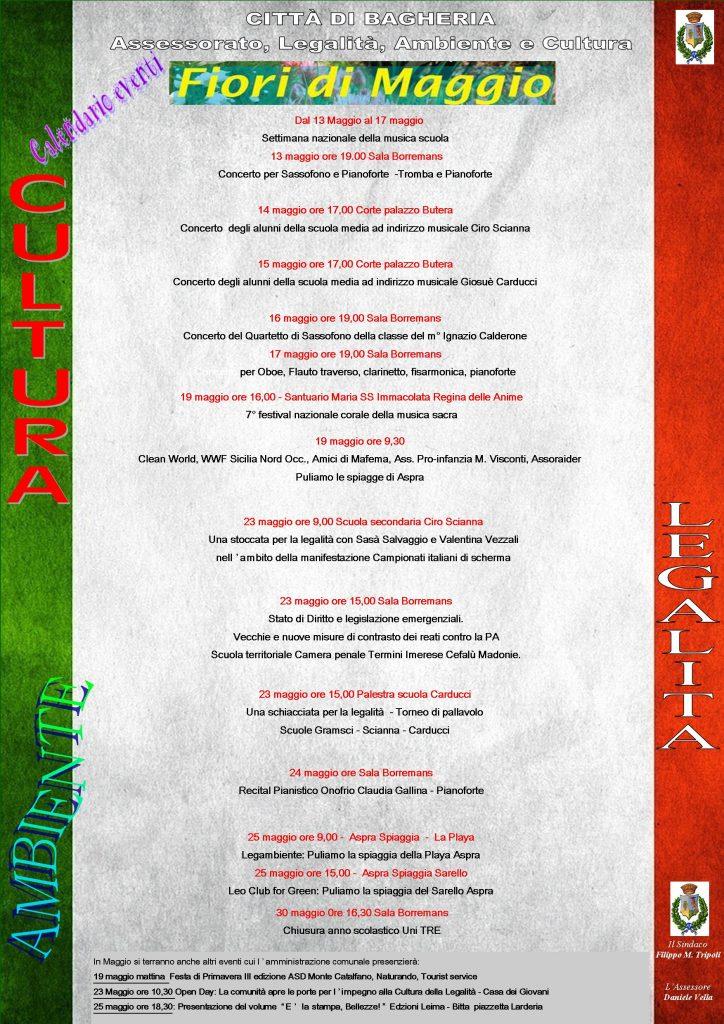 Tutte le iniziative promosse da questo primo calendario sono eventi di spessore che riguardano la musica; già in corso la stagione concertistica “Città di Bagheria” a cura dell’associazione culturale Bequadro che si innesta con la “Settimana nazionale della musica a scuola” che vedrà protagoniste le scuole medie Carducci e Scianna, ma anche la legalità: maggio è infatti il mese in cui si ricorda, con dolore, l’eccidio del giudice Giovanni Falcone, di sua moglie, il magistrato Francesca Morvillo e dei giovani agenti di scorta; diversi gli eventi legati a questa commemorazione.