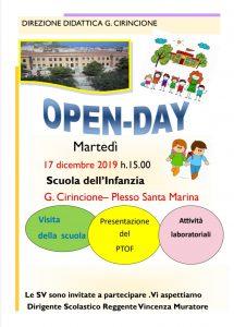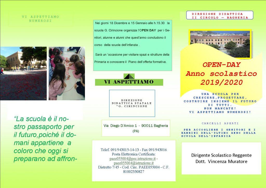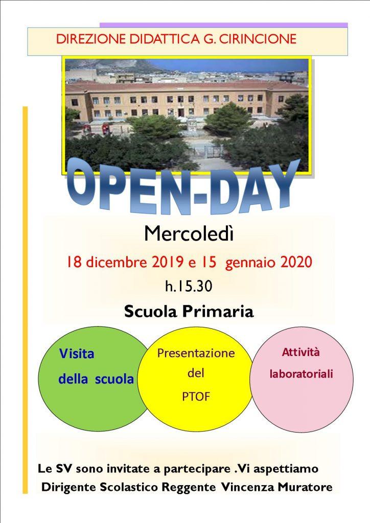 Nei giorni 17 e 18 dicembre e 15 gennaio 2020, la scuola G. Cirincione, organizza l’OPEN DAY per i genitori, alunne e alunni che quest'anno inizieranno la scuola primaria o la scuola dell'infanzia.