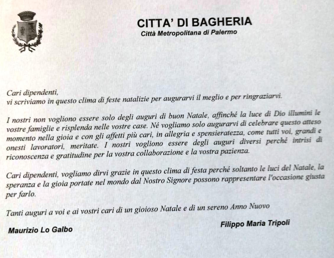 Il sindaco di Bagheria, Filippo Maria Tripoli e l'assessore al Personale Maurizio Lo Galbo a nome loro e di tutta la Giunta, hanno inviato un messaggio augurale di serene festa a tutti i dipendenti comunali che qui riportiamo:
