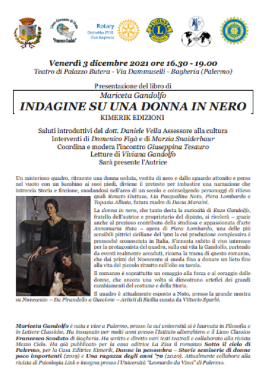 Presentazione del libro di Mariceta Gandolfo: "INDAGINE SU UNA DONNA IN NERO" venerdì 3 dicembre 2021 ore 16.30. Teatro di Palazzo Butera.