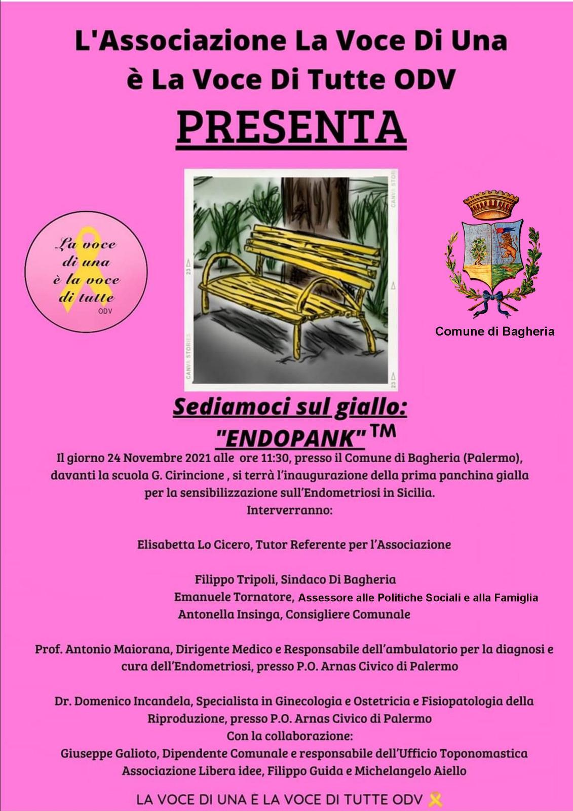 L'associazione "La Voce di Una è la voce di tutte ODV" organizza con il patrocinio del Comune di Bagheria l'inaugurazione e la posa della prima panchina gialla per la sensibilizzazione alla conoscenza dell'endometriosi in Sicilia.