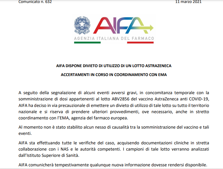 Nessuna dose del lotto *ABV2856* del vaccino AstraZeneca anti COVID-19 somministrato dall'ASP 39