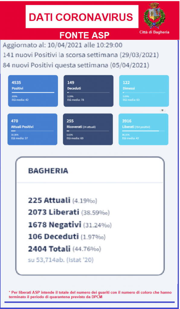 Intanto i dati inviati da ASP aggiornati al 10 aprile registrano 225 positivi attuali a Bagheria e 470 nell'intero distretto. 106 deceduti a Bagheria e 149 in totale nel distretto.