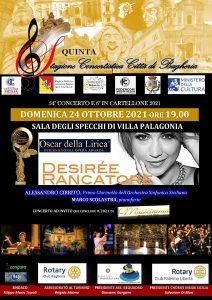 È il 55° concerto della stagione concertistica "Città di Bagheria" il settimo dell'edizione 2021, il concerto di Desirée Rancatore dal titolo "Un concerto da Oscar" che si terrà domenica 24 ottobre 2021, alle ore 19,00 nella Sala degli Specchi a villa Palagonia.