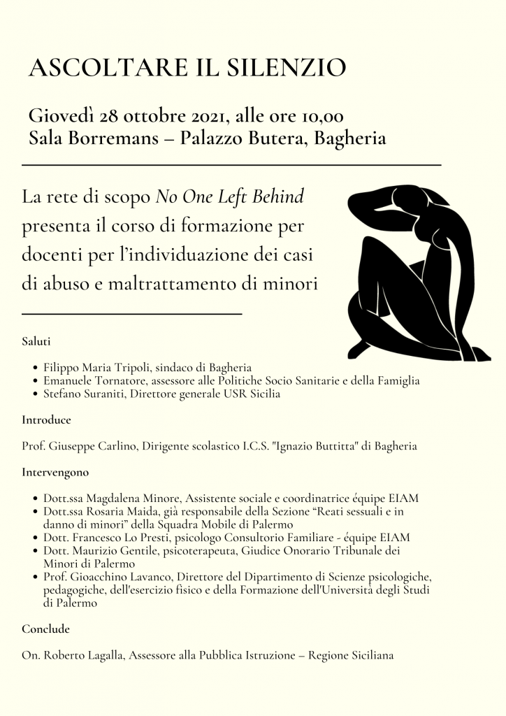 Un corso di formazione per 90 docenti al fine di individuare casi di abuso e maltrattamento dei minori sarà presentato giovedì 28 ottobre, alle ore 10,00 presso la sala Borremans di villa Butera. Organizzato dalla rete di scopo No One left Behind.
