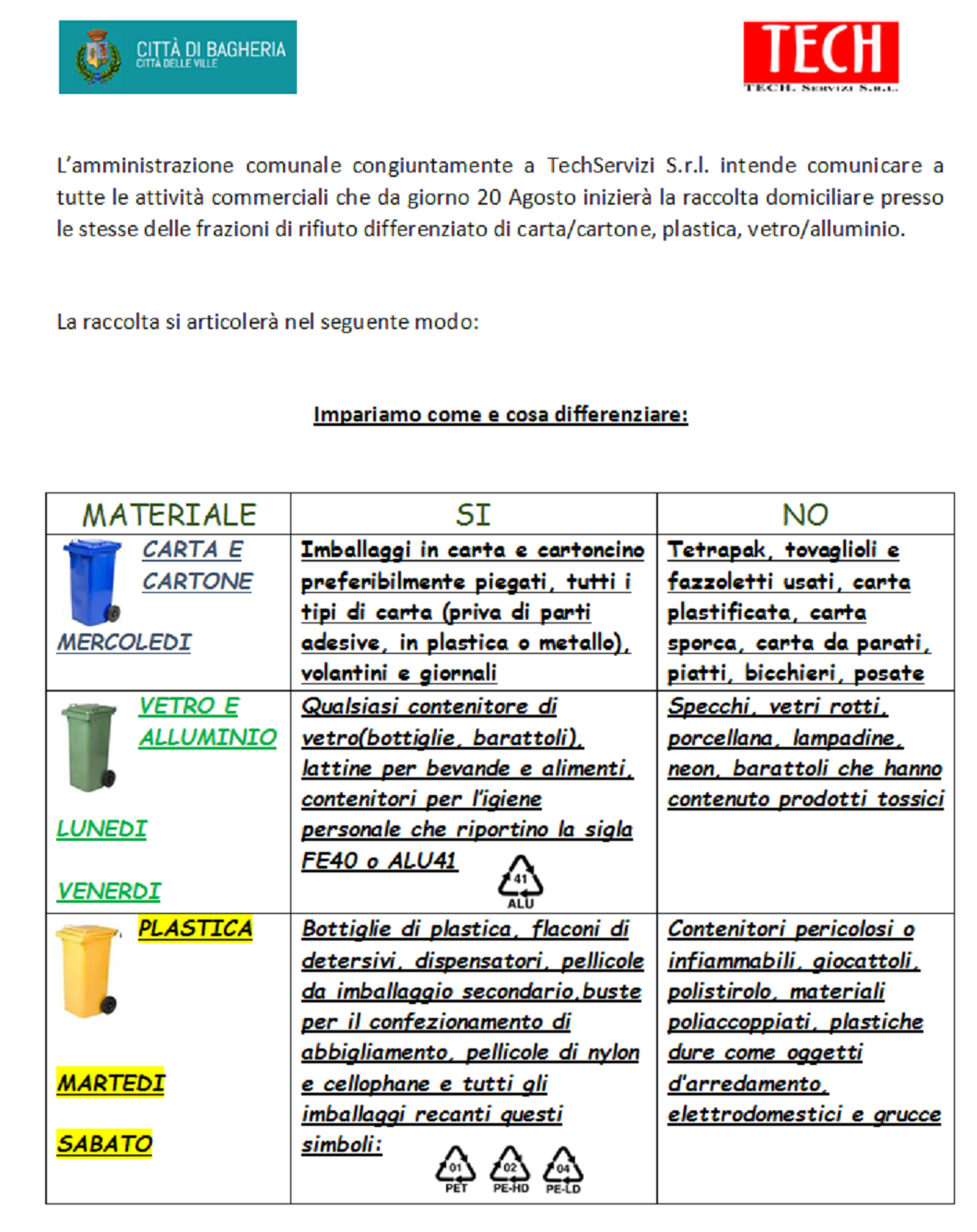 Parte la raccolta differenziata a Bagheria. L’Amministrazione Comunale informa che a partire dal 20 agosto prossimo verrà avviato il servizio di raccolta differenziata sul territorio comunale.