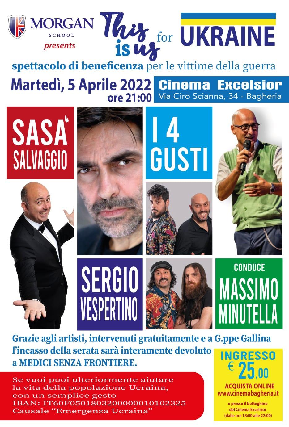 A partire dalle ore 21:00, presso il cinema Excelsior, messo a disposizione gratuitamente dal gestore Giuseppe Gallina, si terrà lo spettacolo di beneficenza per le vittime della guerra, dal titolo:"This is us for UKRAINE".