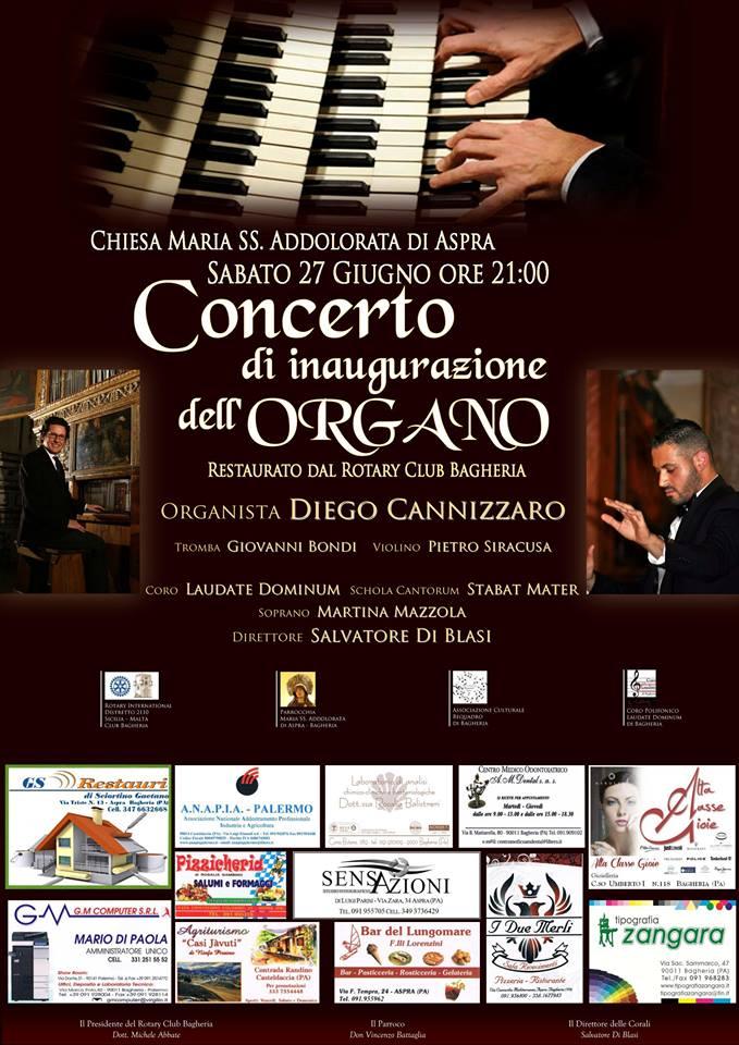 Il primo incontro al quale sono invitati tutti gli amanti della musica avrà luogo Sabato 27 Giugno alle ore 21:00, presso la Chiesa Maria SS. Addolorata di Apra-Bagheria, dove, alla presenza del Parroco Don Vincenzo Battaglia, si svolgerà il “CONCERTO DI INAUGURAZIONE DELL’ORGANO”, in seguito alla restaurazione ad opera di esperti, che da anni necessitava di un intervento radicale posticipato causa mancanza fondi, fino ad oggi.