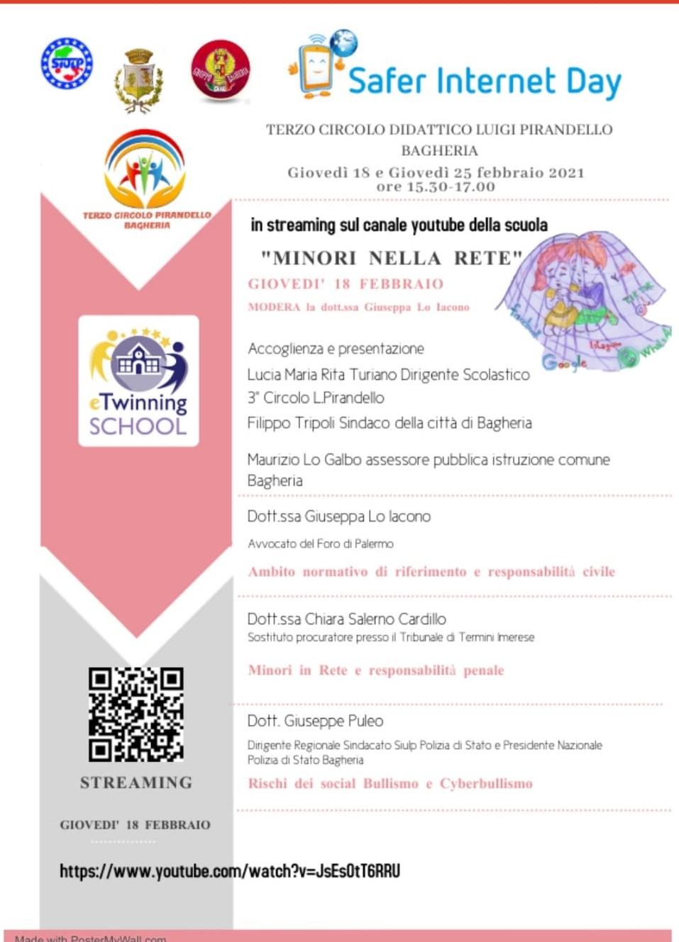 Il 3° Circolo L.Pirandello di Bagheria ha organizzato e promosso un evento multimediale in diretta streaming               “ Minori dentro la rete” sul canale youtube della scuola Giovedì 18 febbraio e Giovedì 25 febbraio 2021 dalle ore 15:30 alle ore 17:00.