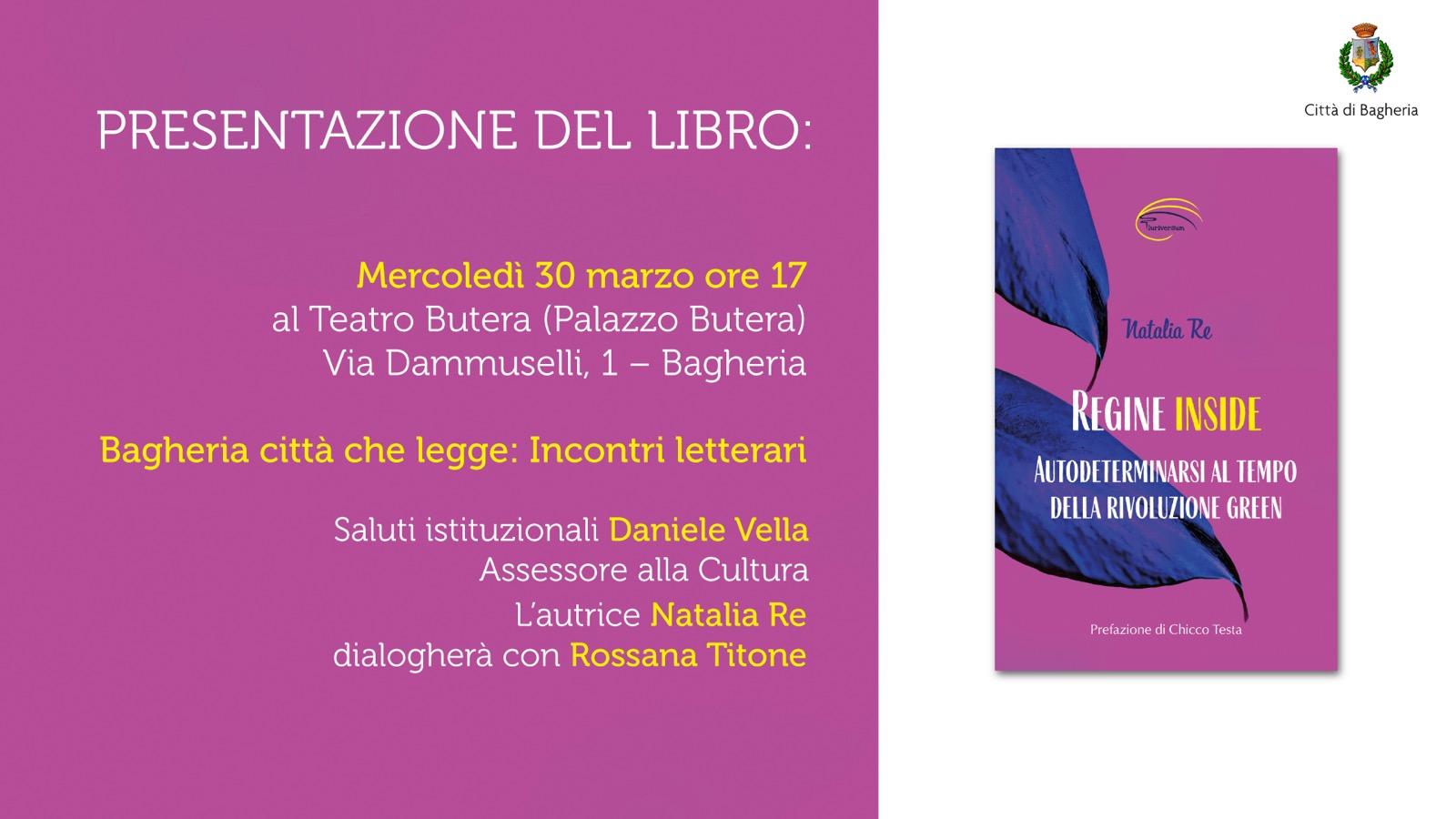 Sarà il libro di Natalia Re : "Regine Inside. Autodeterminarsi al tempo della rivoluzione green" ad essere presentato nel corso dell'ultimo appuntamento, previsto per il 30 marzo 2022, che chiuderà la rassegna di appuntamenti di promozione della lettura “I mercoledì della lettura – Bagheria Città che legge”.