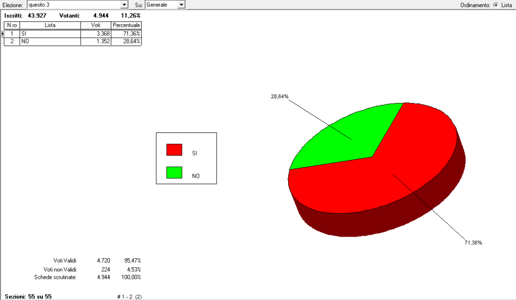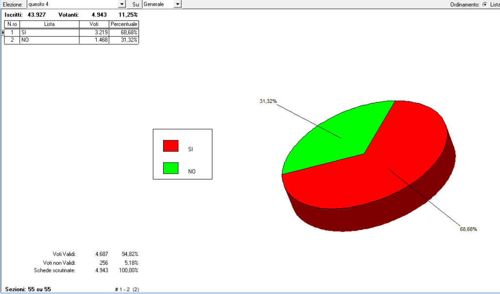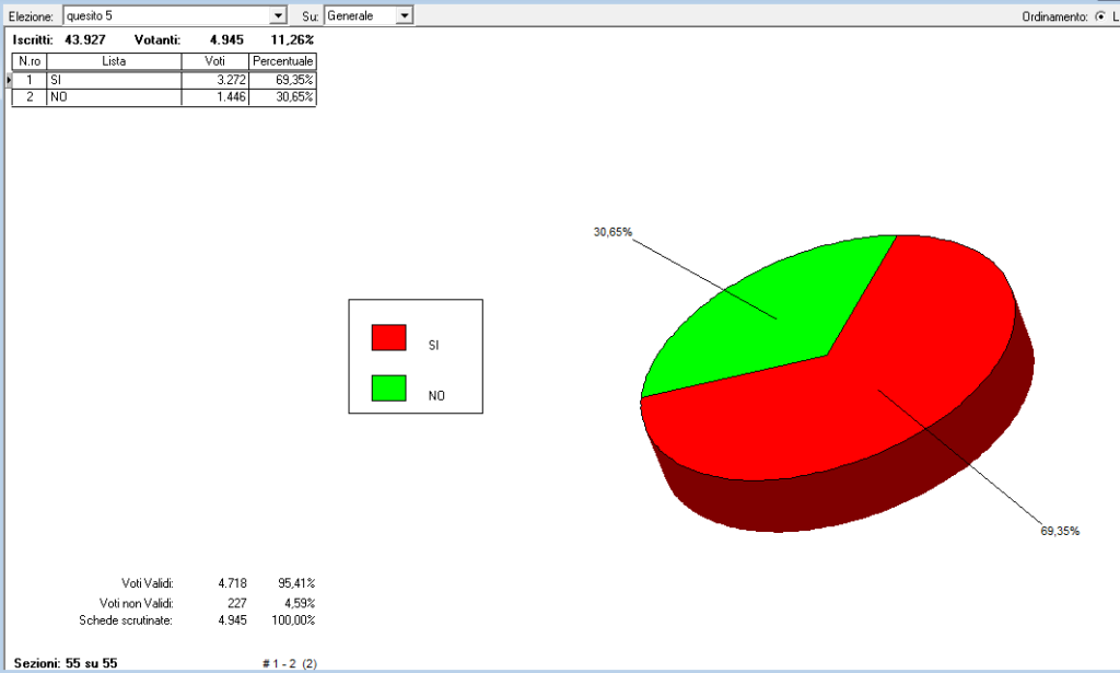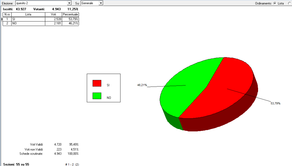 Quesito n. 2 i SI sono 2.539 con una percentuale pari al 53.79 %, 2.181 sono i NO con una percentuale pari al 46.21%