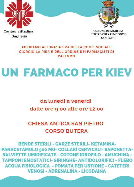 L’amministrazione Comunale con il suo Centro Operativo Socio Sanitario sostiene la campagna di raccolta di farmaci e materiali sanitari organizzata dalla Coop. sociale La Pira e l’Ordine dei Farmacisti della provincia di Palermo per la popolazione Ucraina.