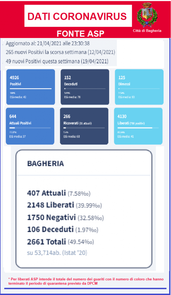 I dati aggiornati a ieri sono sulla diffusione del contagio: 2661 i positivi dal primo settembre 2020. Gli attuali positivi: 407, i deceduti 106.